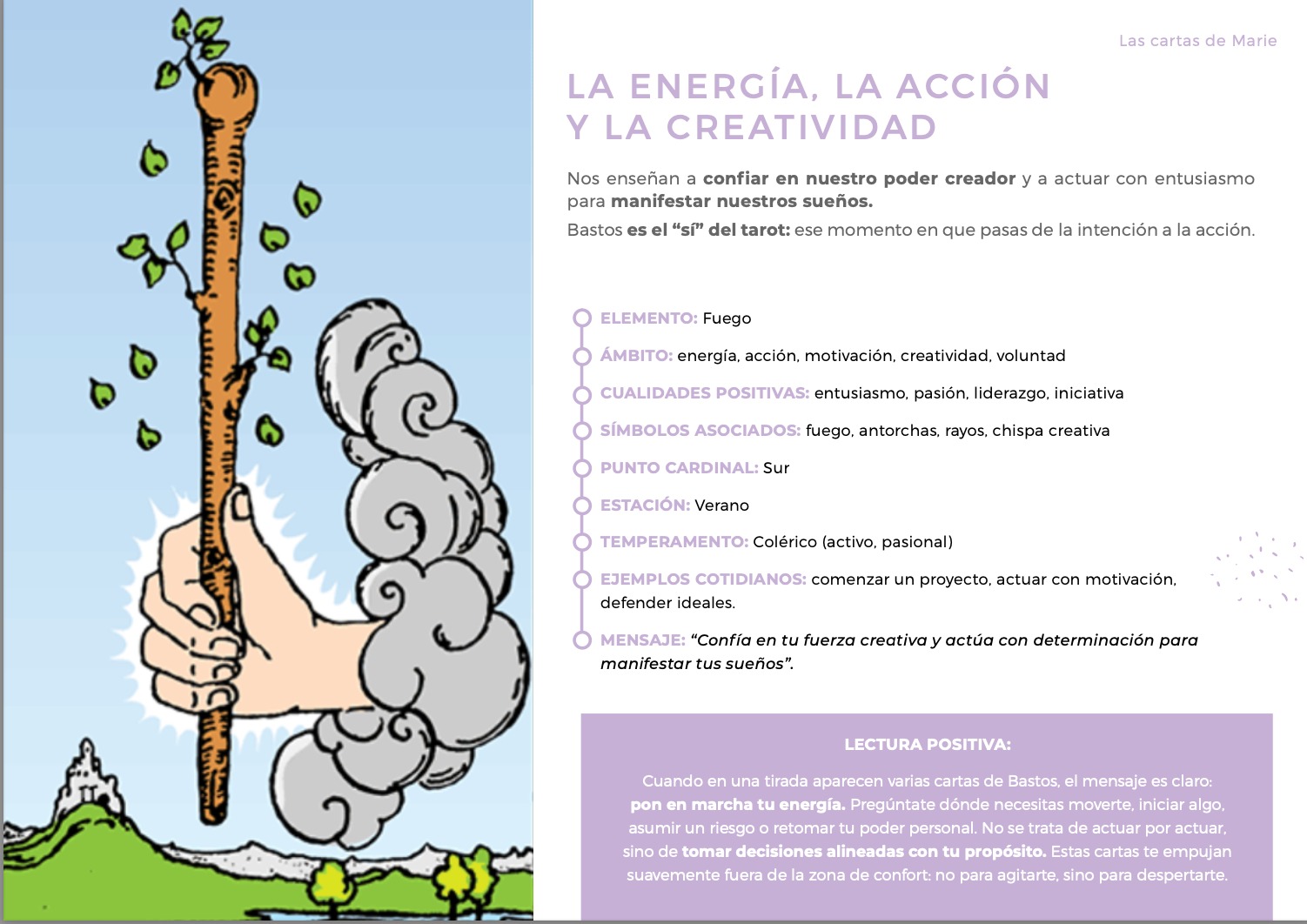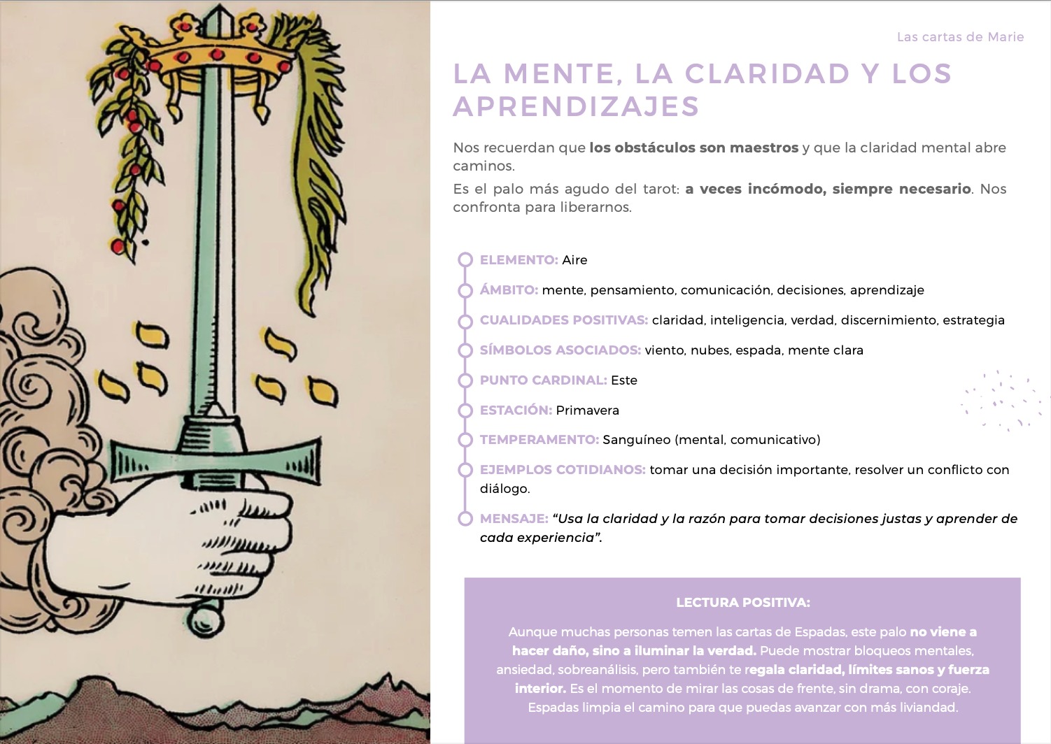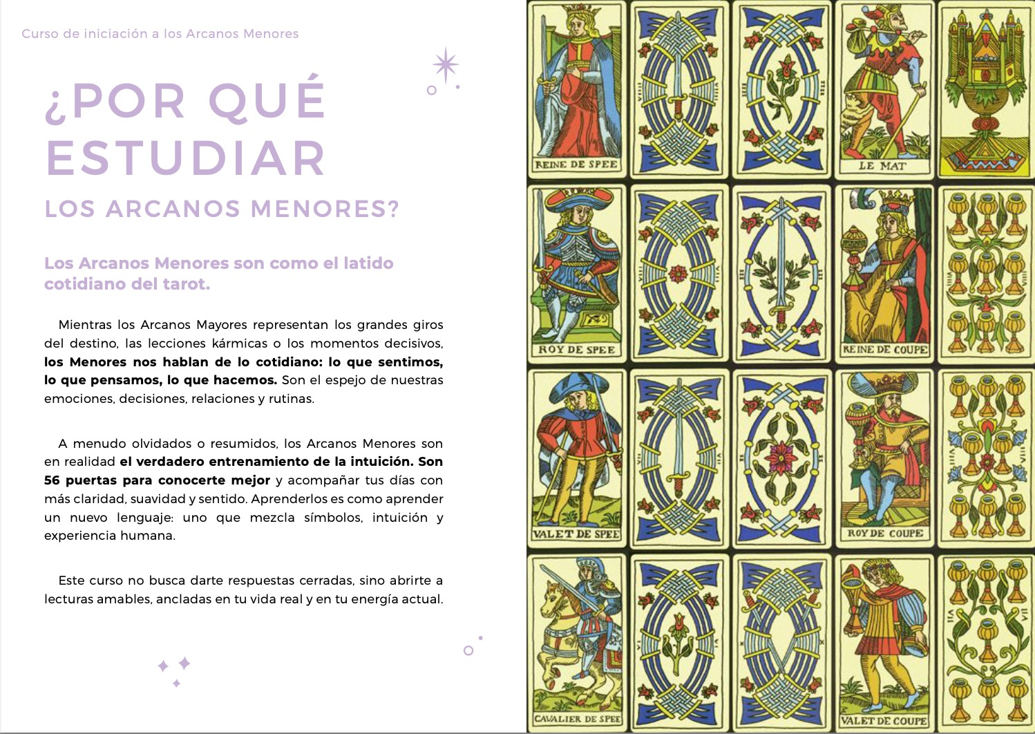 Se compone de 1 video completo y 1 documento teórico detallado para iniciarte a los arcanos menores, y empezar a usarlos en tus tiradas, si lo deseas. Para empezar, recomendaría solo el uso de los arcanos mayores, que ya transmiten tanta información, pero es muy interesante para ti profundizar tu aprendizaje sabiendo lo que significan los arcanos menores, con el fin de matizar un poco las tiradas.