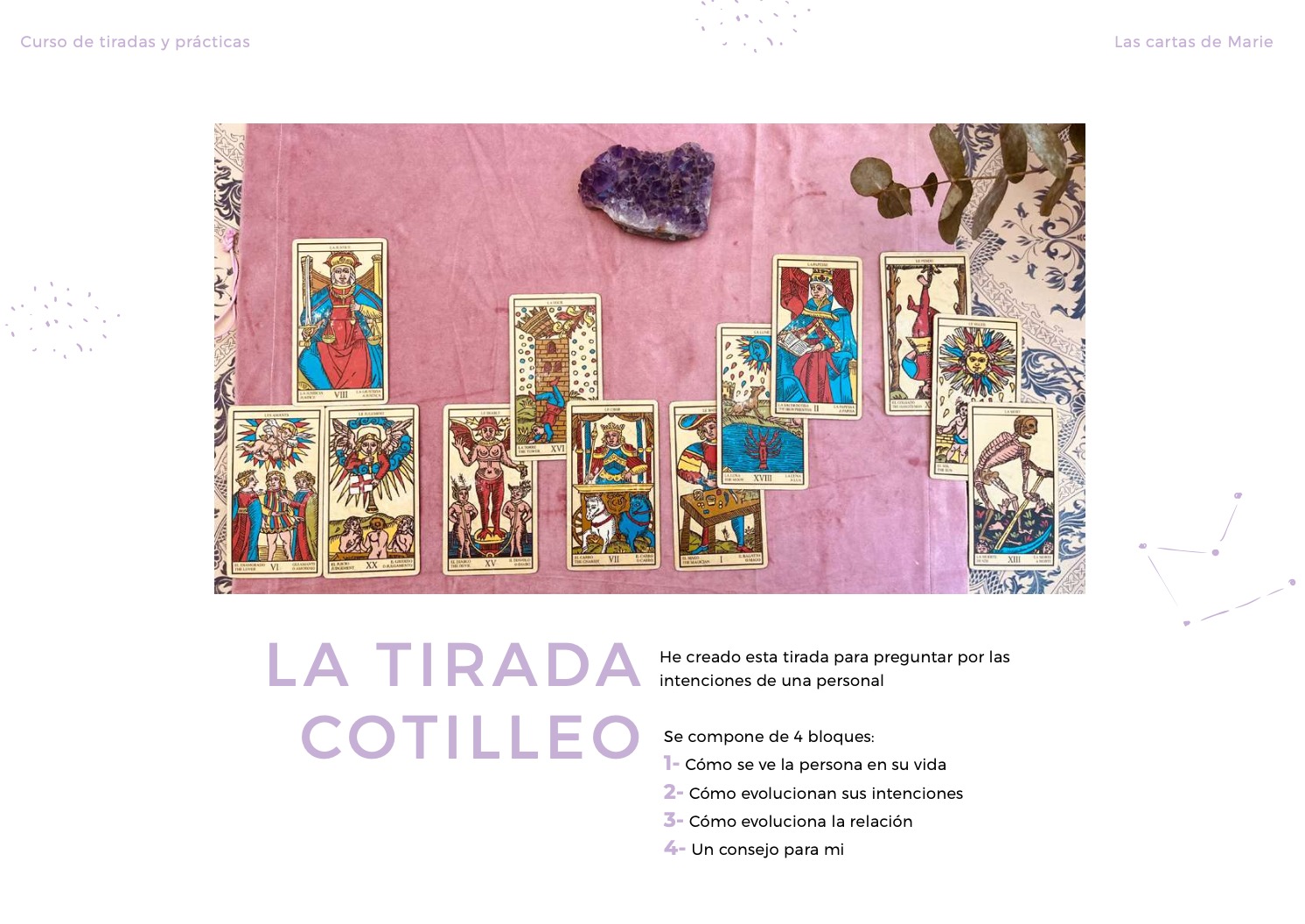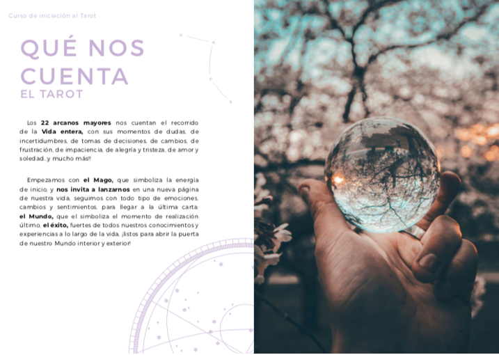 Este curso se compone de 4 videos completos y 1 documento teórico detallado con fotos de cada paso, para enseñarte 4 tiradas profundizadas, además de la carta del día, y que podrás adaptar según la temática y la pregunta que haces a las cartas.