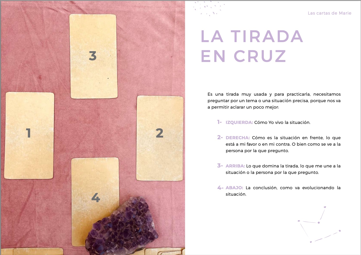 Con esta tirada, se puede preguntar por un tema general (amor, trabajo, proyectos…) o bien hacer una pregunta precisa. Si lo necesitamos, podemos también profundizar cada aspecto, eligiendo más cartas.