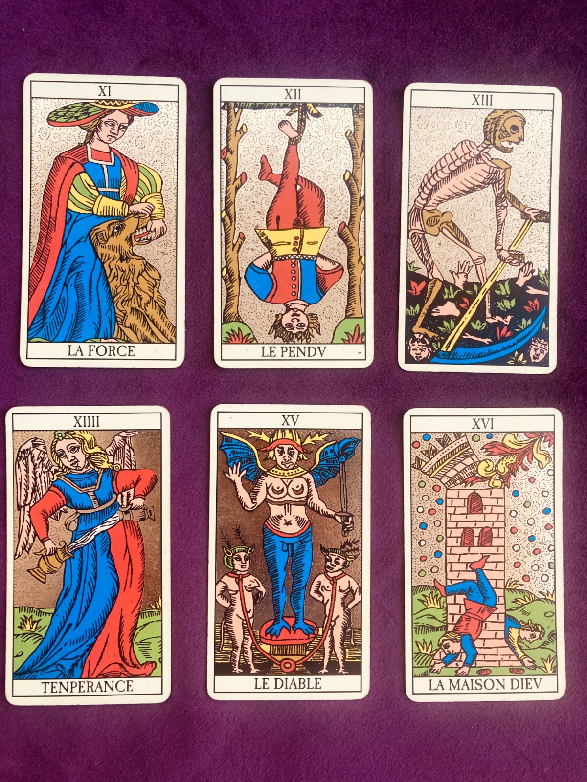 La Fuerza, el Colgado, la Muerte, la Templanza, el Diablo y la Torre.